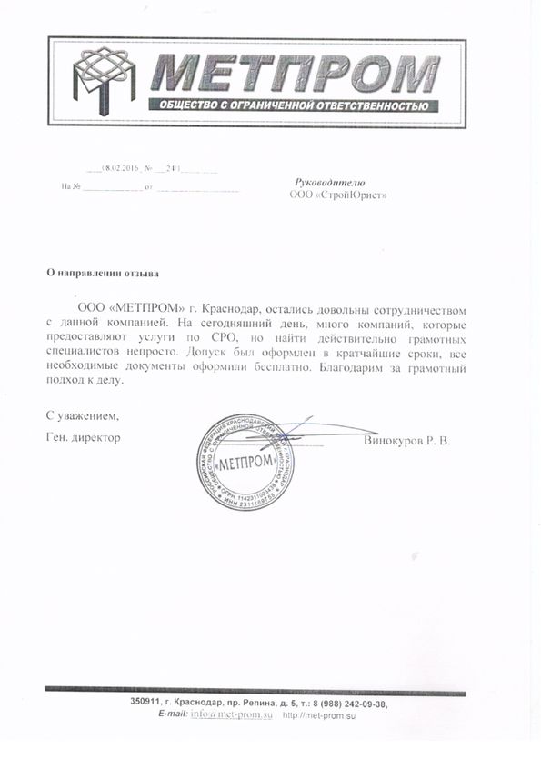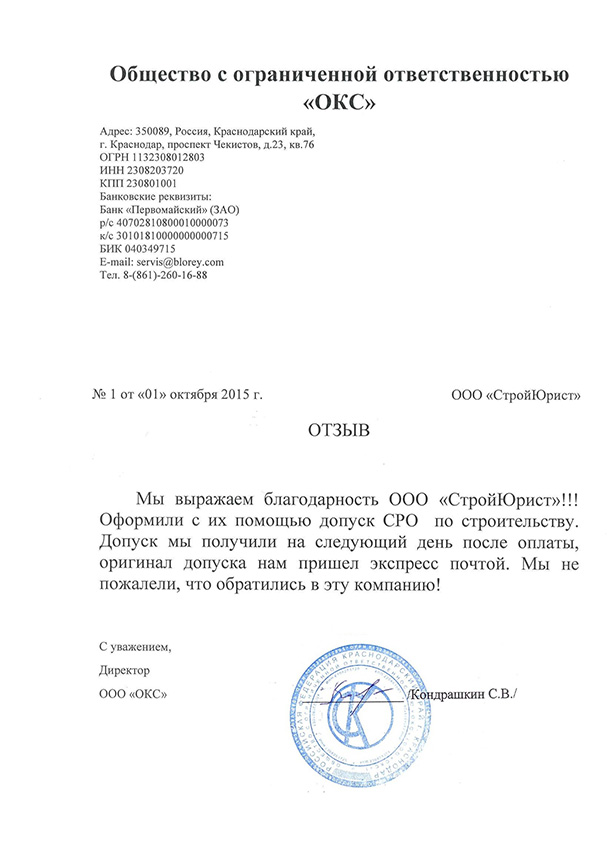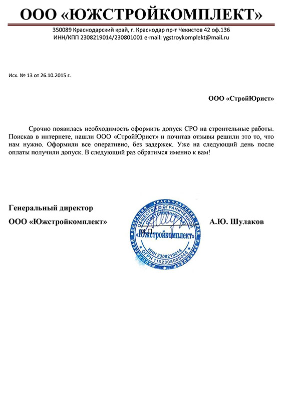 Отзывы клиентов "СтройЮрист" по вступлению в СРО в Таганроге