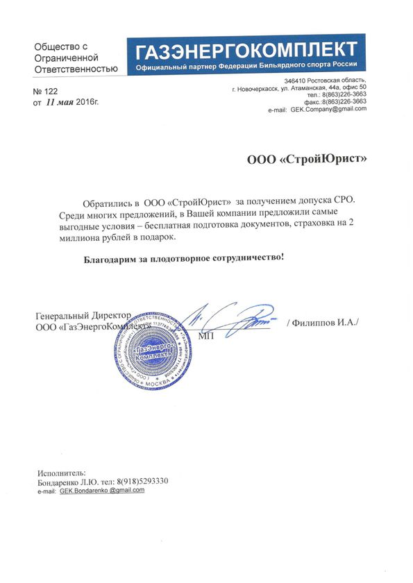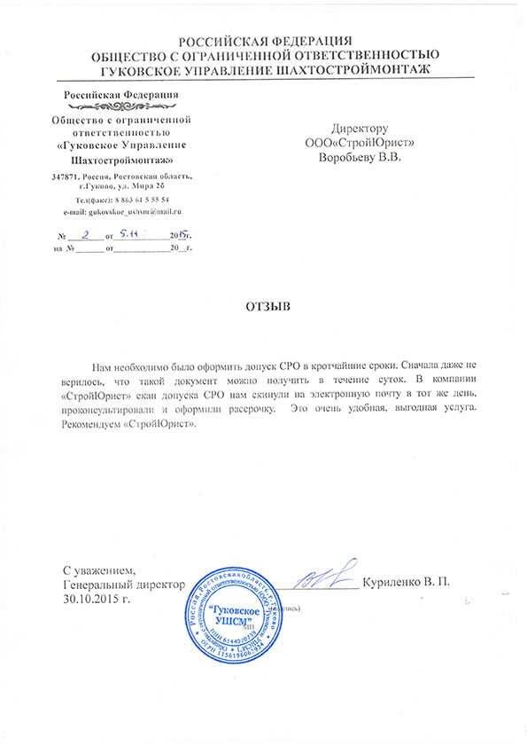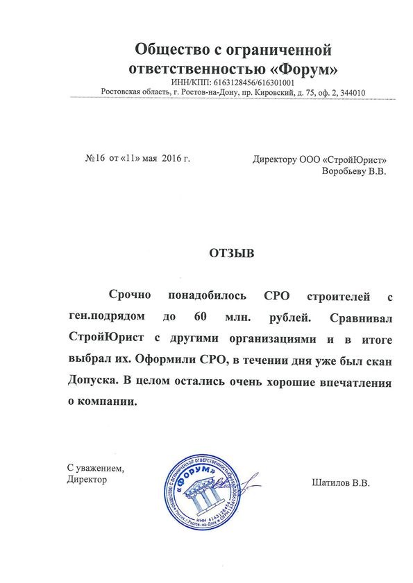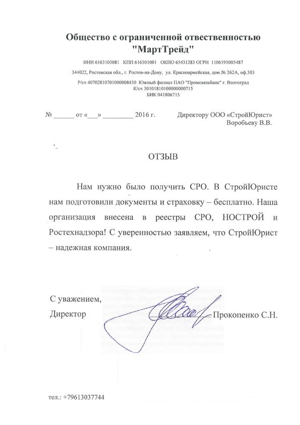 Отзывы клиентов "СтройЮрист" по вступлению в СРО в Таганроге