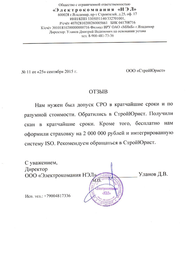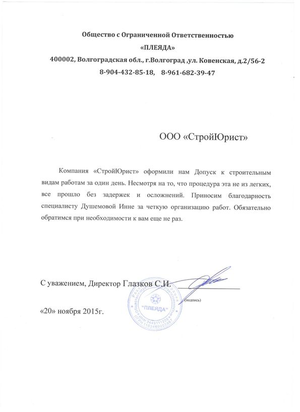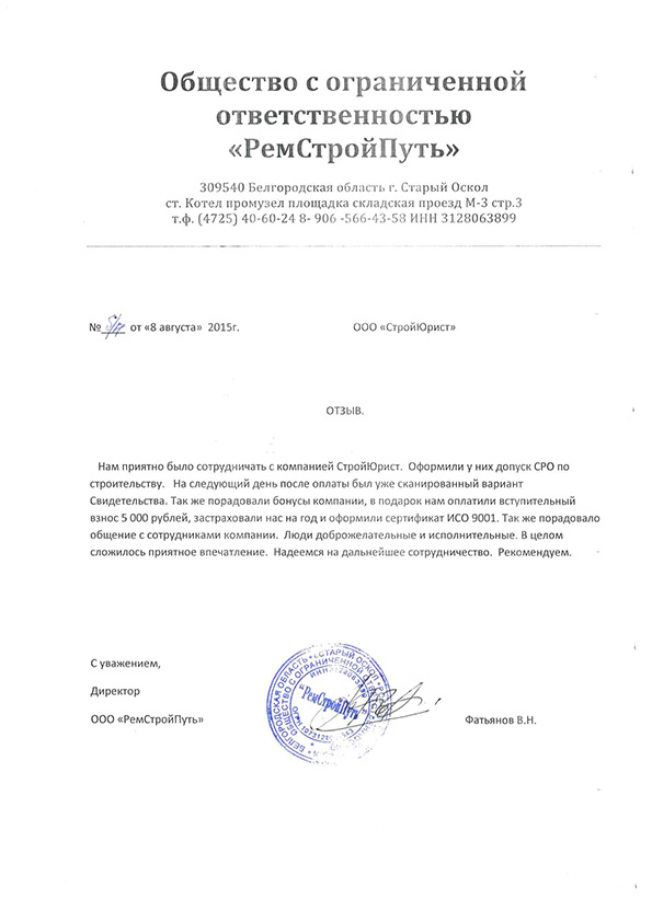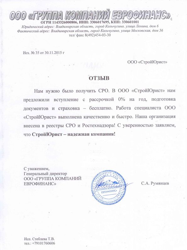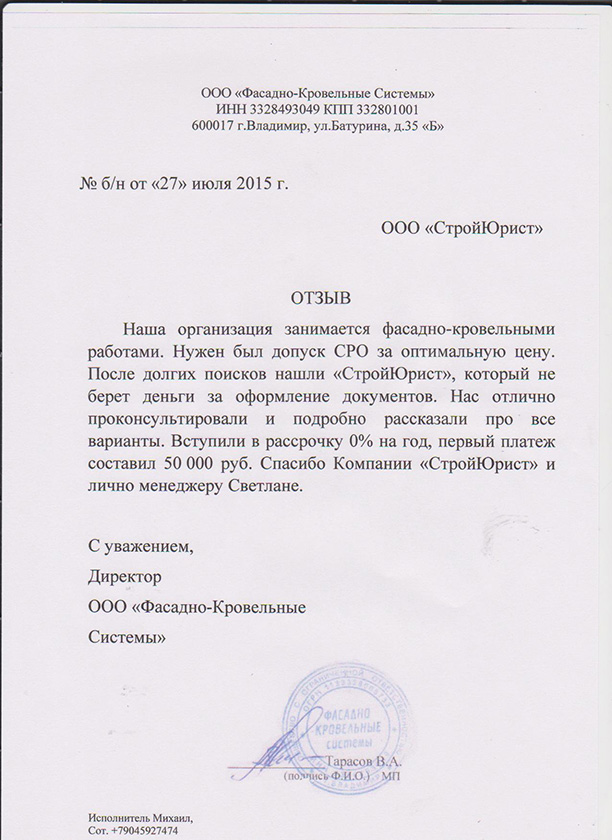 Отзывы клиентов "СтройЮрист" по вступлению в СРО в Таганроге